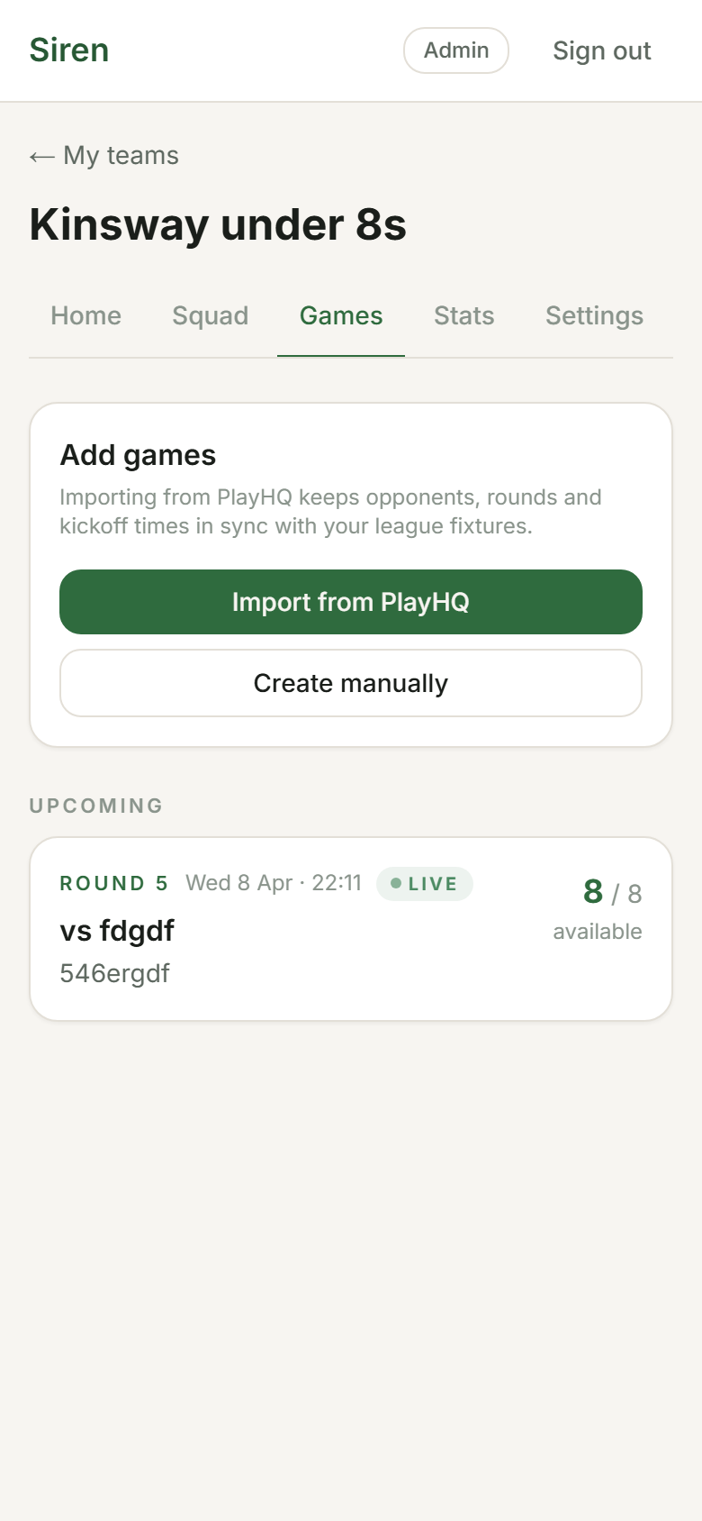 Each team has a games list where you can schedule upcoming matches, open the live game view on the day, and review past results.