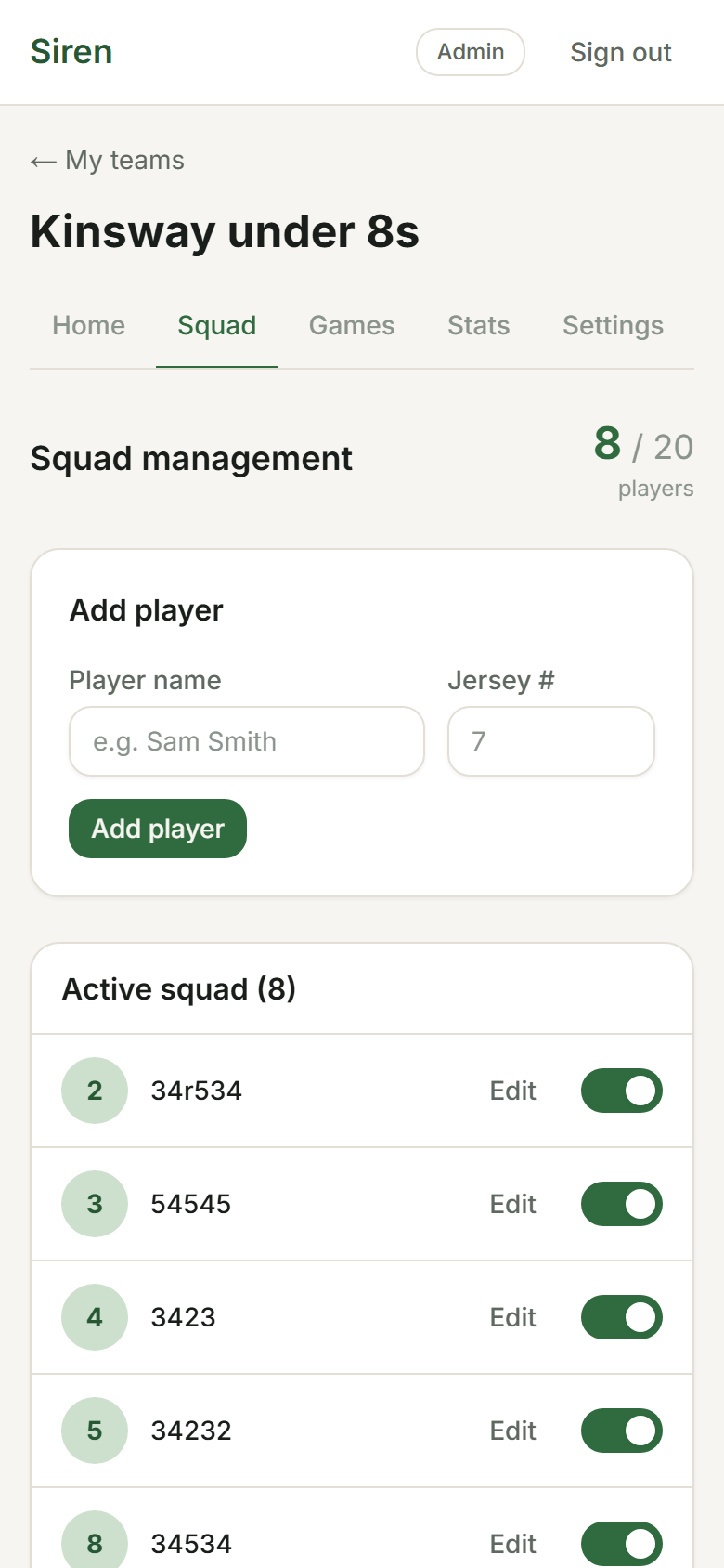 You can add more players at any time, including on game day. See Squads for editing, removing, and managing availability.