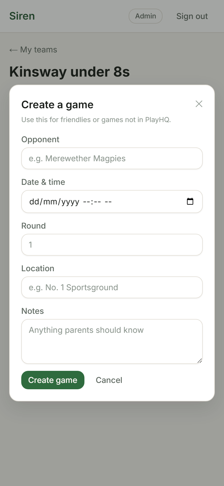 - Live Game β Running a game on the day: lineups, scoring, subs, quarter breaks.