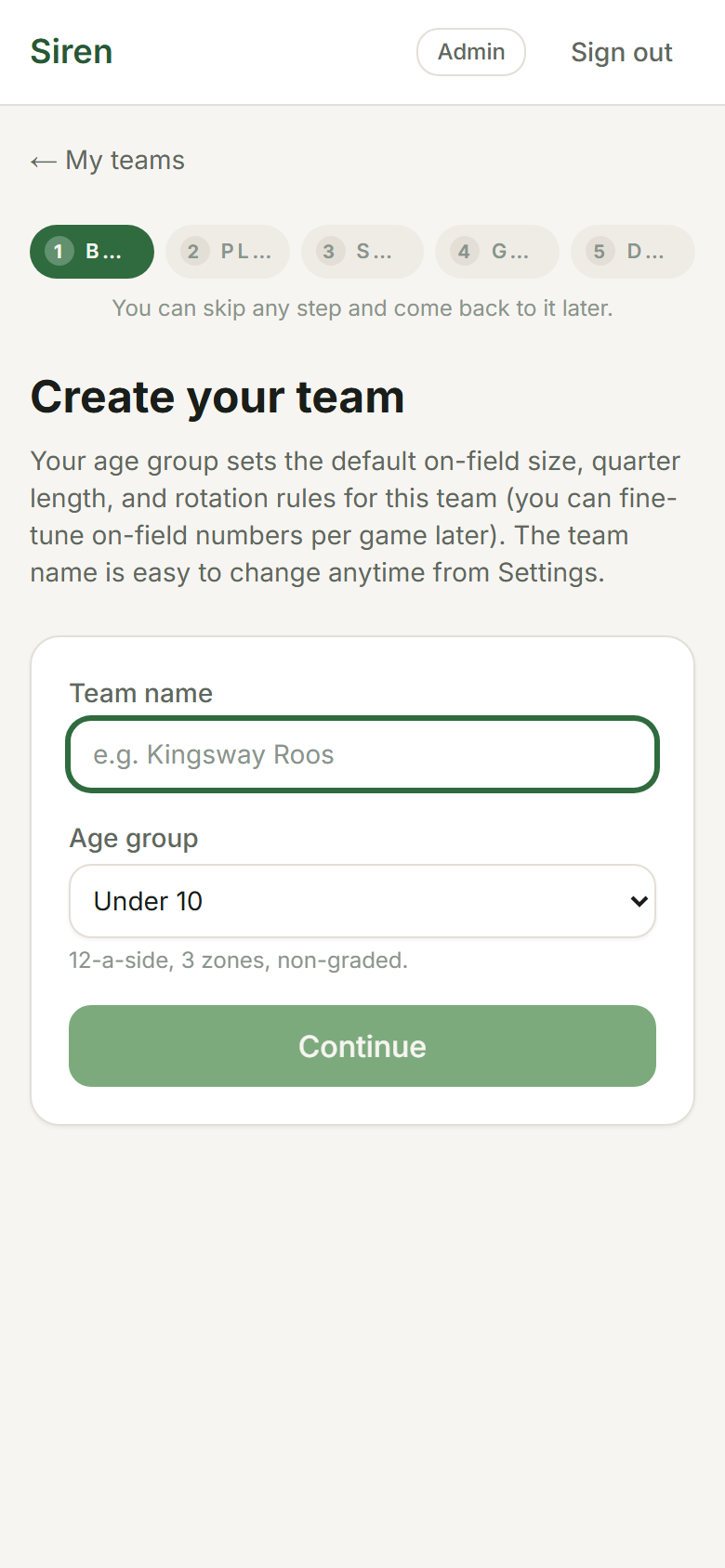 - Give your team a name (e.g. Brunswick U10s) and select the age group / position model. The position model controls how many zones appear on the field and how rotation suggestions are generated.