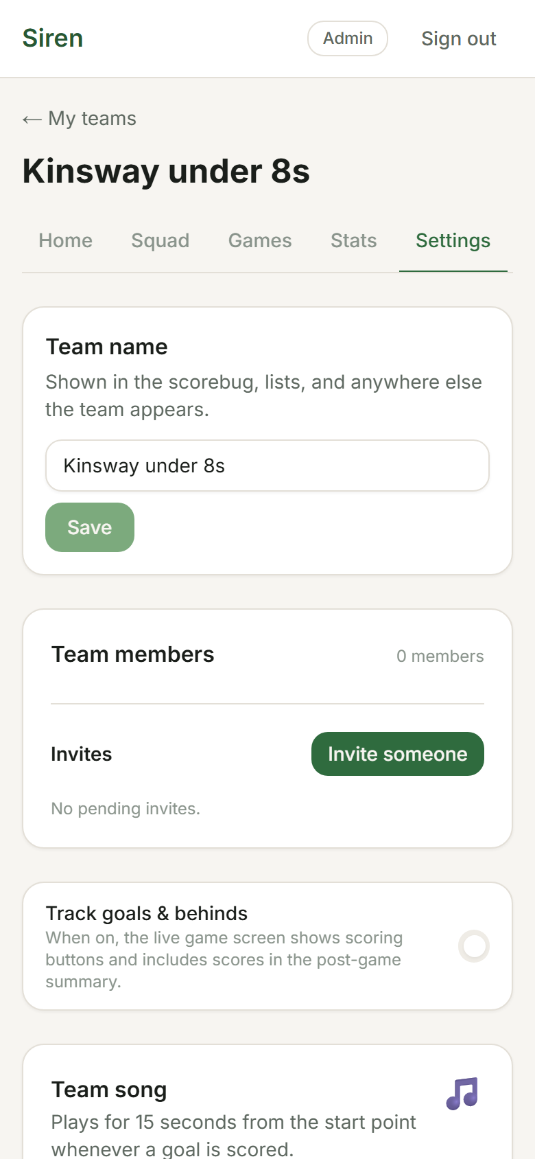A team is the container for your squad, games, and season stats. You can manage multiple teams from the same account — for example if you coach an U10s and an U12s group in the same club.